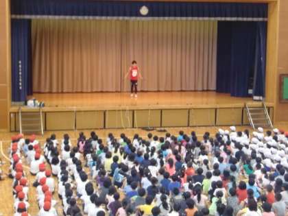 今日はオリンピック・パラリンピック教育の一環でRope performance teamなわとび小助から生山ヒジキさんに来ていただきました。パフォーマンスを見せていただくとともに子ども達に短縄の指導をしていただきました。