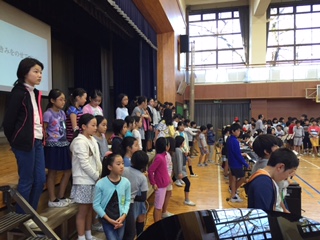 今日は、音楽委員会の伴奏で「君をのせて」を全校で合唱しました。前に並んだ合唱団のメンバーも含め、お互いの声を聴きながらハーモニーを奏でることができました!