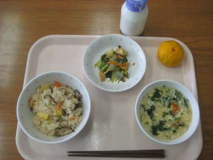 吹き寄せごはん 煮びたし かきたま汁 みかん 牛乳