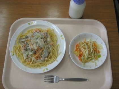 スパゲッティきのこソース じゃがいものフレンチサラダ 牛乳