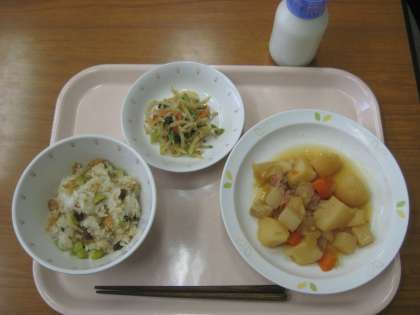 まめまめおこわ 肉じゃがうま煮 野菜のごまあえ 牛乳