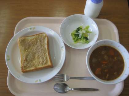 セサミトースト ビーンズシチュー ブロッコリーのサラダ 牛乳