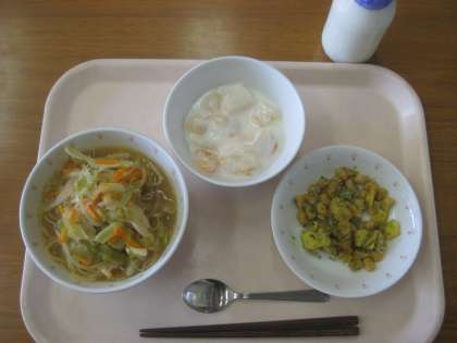 みそラーメン カリカリのりじゃが豆 フルーツヨーグルト 牛乳