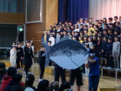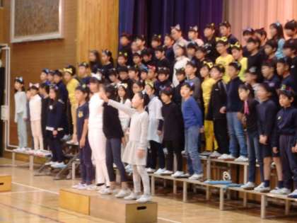 後半の最初は4年生の「11ぴきのねこ」です。全員の動きが揃っていて、声も大きく良く出ていました。ソロで歌う子ども達の声もよく響いていました。ねこ耳も一人一人が手作りをしたものです。とてもかわいらしい素敵な発表でした。