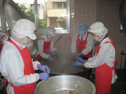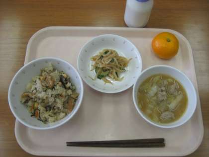 五目ごはん とびうおのつみれ汁 ごま酢かけ みかん 牛乳