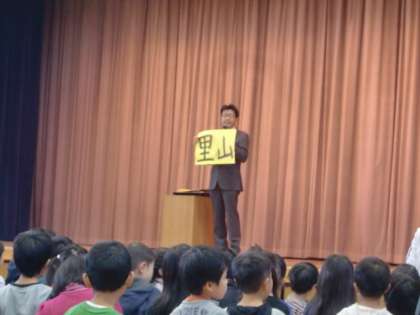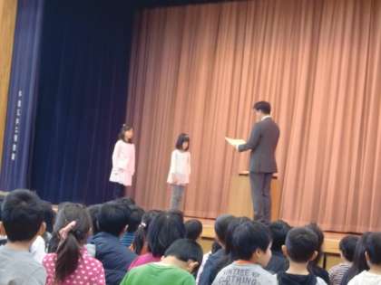 先週、舞台発表会が終わったばかりですが、今日は11月の土曜授業日です。朝会では、校長先生から明正の自慢として「里山」の紹介があり、その他、表彰が行われました。