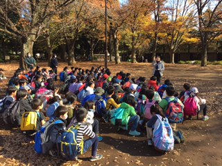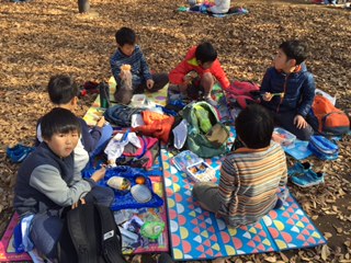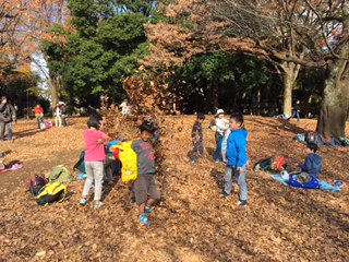 待ちに待ったお弁当タイム。みんなあっという間に食べ終わり、落ち葉のシャワーで遊びました。これから代官屋敷に向かいます!