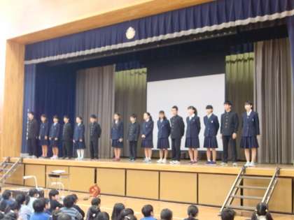 今朝は砧中学校の生徒たちと明正小学校の代表委員会の児童で正門前に立ち、小中合同のあいさつ運動を行いました。その後、体育館で中学生があいさつの大切さについて話をしてくれました。