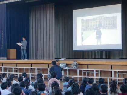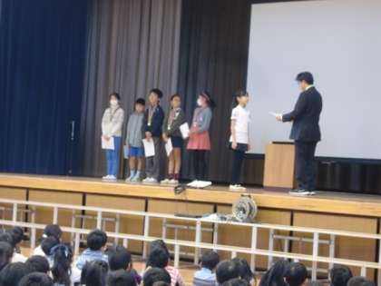 先日、海外派遣でオーストリアに行った5年生の児童の海外派遣報告があり、その後は様々な表彰が行われました。