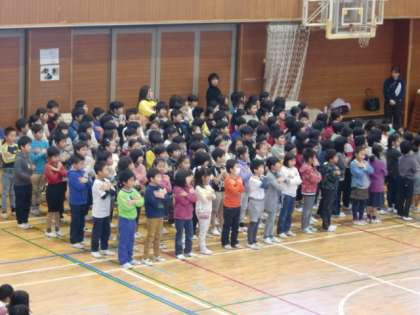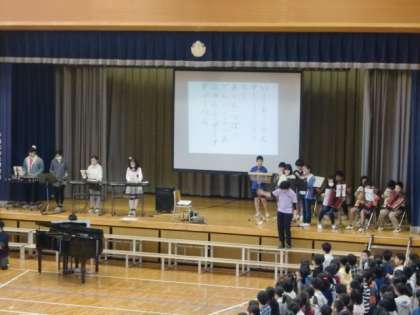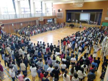 今朝は体育館で音楽朝会がありました。