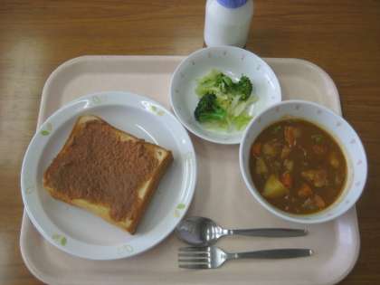 きな粉バタートースト ポークシチュー ブロッコリーのサラダ 牛乳