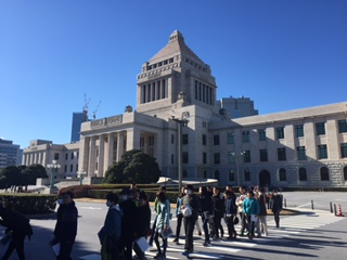 国会議事堂の見学が終わり、これから外で記念撮影をします。たくさんの学校が来ているため、県木を見ながら順番待ちをしています!
