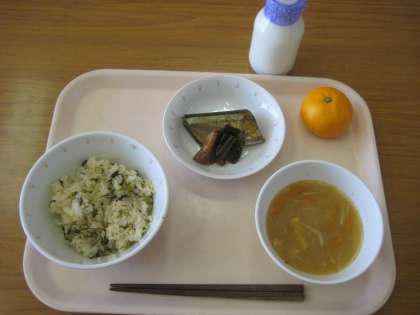 菜めし さんまの松前煮 大根のみそ汁 みかん 牛乳
