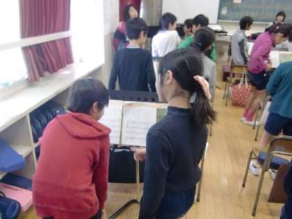 音楽室では4年生が授業を受けていました。「とんび」を歌いペアの友達と歌い方で良かったところを褒めあっていました。とてもよい響きがしていました。