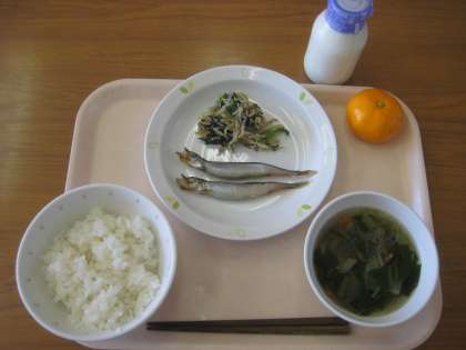 ごはん 焼きししゃも ほうれん草の磯和え 根菜汁 みかん 牛乳