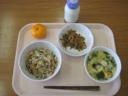 五目ごはん きんぴらごぼう かきたまじる みかん 牛乳