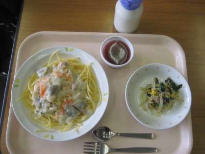 スパゲッティクリームソース 牛乳 ほうれん草サラダ ぶどうゼリー