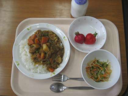カレーライス 牛乳 こんにゃくサラダ いちご
