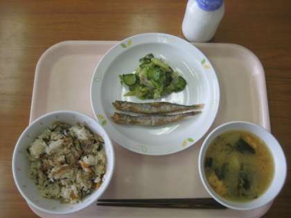 ひじきごはん 牛乳 ししゃものからあげ 野菜のゆかりかけ じゃがいもとわかめのみそ汁