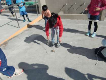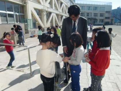 生活科の時間、1年生はむかしあそびの一環としてコマ回しにチャレンジしていました。なかなか上手にまわせない様子もあり、校長先生に回し方のコツを教えてもらっていました。
