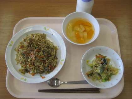 ソースやきそば 牛乳 かむかむ海草サラダ フルーツ白玉
