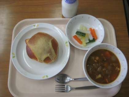 ビスキュイパン 牛乳 ビーンズシチュー ピクルス