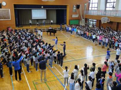 今朝は体育館で音楽朝会を行いました。明日の1年生を迎える会で歌う「おーい・はる」を2〜6年生で練習しました。本番が楽しみです。