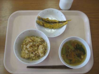 そぼろごはん 牛乳 ししゃものカレーあげ 沢煮椀