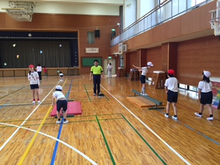 今年度は、児童数が17名に増え、3学級でスタートしました。2校時は、体育でサーキットトレーニングをしていました。お兄さん、お姉さんに声をかけてもらいながら、1年生も元気に過ごしています!