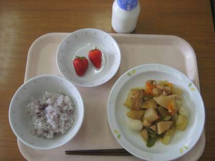 ゆかりごはん 牛乳 春野菜のうま煮 いちご