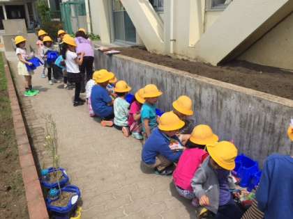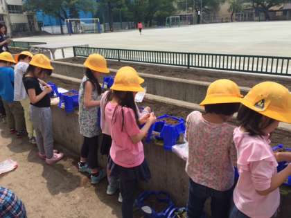 今日、1年生は自分の鉢に土を入れ、朝顔の種をまきました。夏にどんな色の花を咲かせてくれるのか、とても楽しみですね!