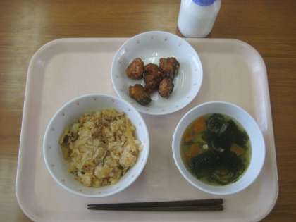 中華おこわ 牛乳 かつおのかりんとうがらめ わかめスープ