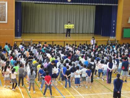 今朝は、体育館で低学年朝会がありました。校長先生から「記念日」についてお話がありました。