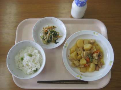 グリンピースごはん 牛乳 新じゃがのそぼろ煮 野菜のごまだれかけ