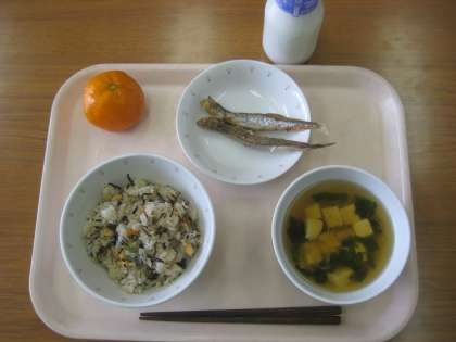 豆入りひじきごはん 牛乳 ししゃものからあげ すまし汁 冷凍みかん