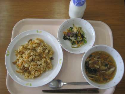 キムチチャーハン 牛乳 かむかむ海藻サラダ 春雨スープ