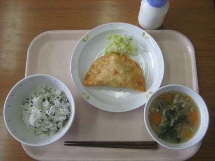 わかめごはん 牛乳 ジャンボぎょうざ サワーキャベツ 中華スープ
