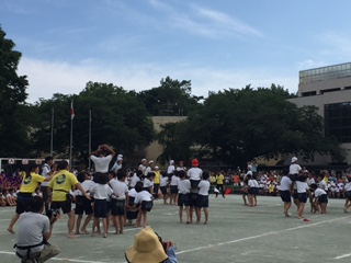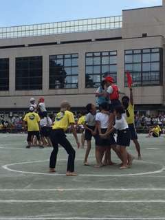 5.6年生の騎馬戦は、女子大将戦が赤、一騎討ちが白、男子大将戦が白。結果、白が勝ちました!