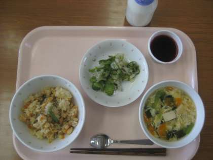 山菜おこわ 牛乳 野菜のゆかりかけ かきたま汁 ぶどうゼリー