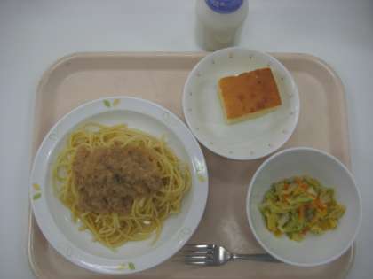 おろしスパゲッティ 牛乳 キャベツとコーンのソテー ぐりとぐらのカステラ