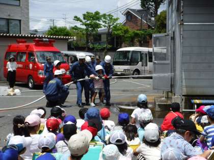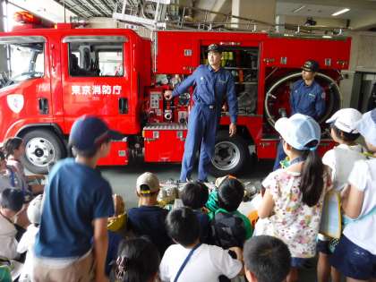 社会科の学習で、成城消防署を見学させてもらいました。目の前のポンプ車やはしご車に興奮しながら、消防士さんの話を熱心に聞いていました。
