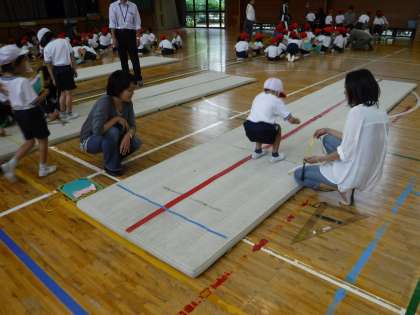 今日は1・2年生が体力テストを行いました。1年生は初めてでしたが、保護者の方にお手伝いしてもらいながら頑張りました。