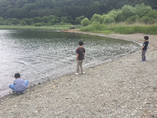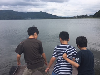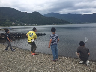 河口湖の湖畔まで出て、水切りをしたり、魚を探したりしました。これからお風呂の準備をします!