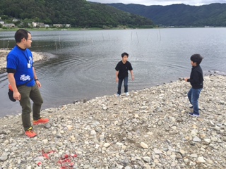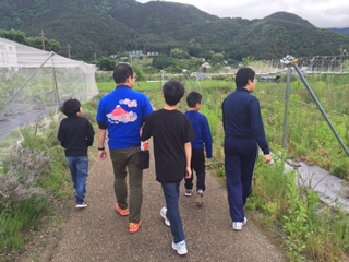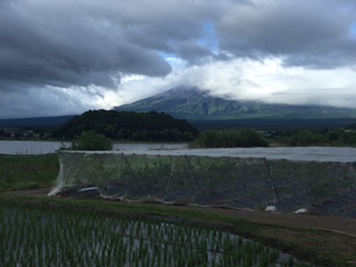 朝を迎えました。みんな早起きで、元気いっぱいなので、お散歩に来ています。まだ雨は降っておらず、富士山も半分くらい見えています!