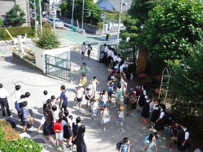 今朝は学び舎あいさつDAYでした。砧中学校の生徒が正門に立ち、あいさつ運動をしました。