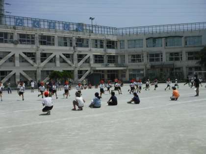 3時間目に、1年生がシャトルランを行いました。はじめてやる1年生のために、6年生がお手伝いにきてくれました。