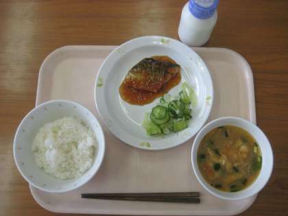ごはん 牛乳 さばの黒酢あんかけ ひと塩野菜  切干大根のみそ汁