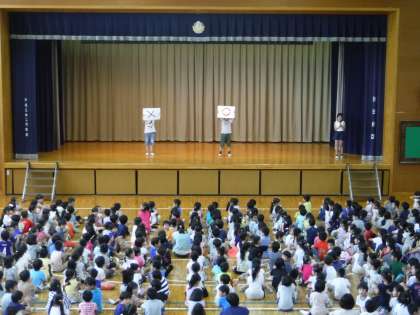 今朝は、体育館で児童集会があり、イントロクイズで楽しみました。
