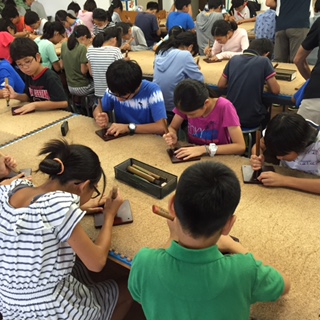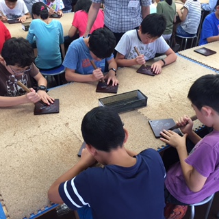 東照宮をあとにして、日光彫りの体験にきました。説明を聞いてから、今、彫り始めたところです。完成を楽しみにしていてください!