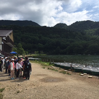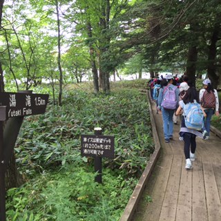 湯ノ湖に到着しました。これからハイキングに出発します。まずは、湯滝を目指します。どうか、熊には出会いませんように!